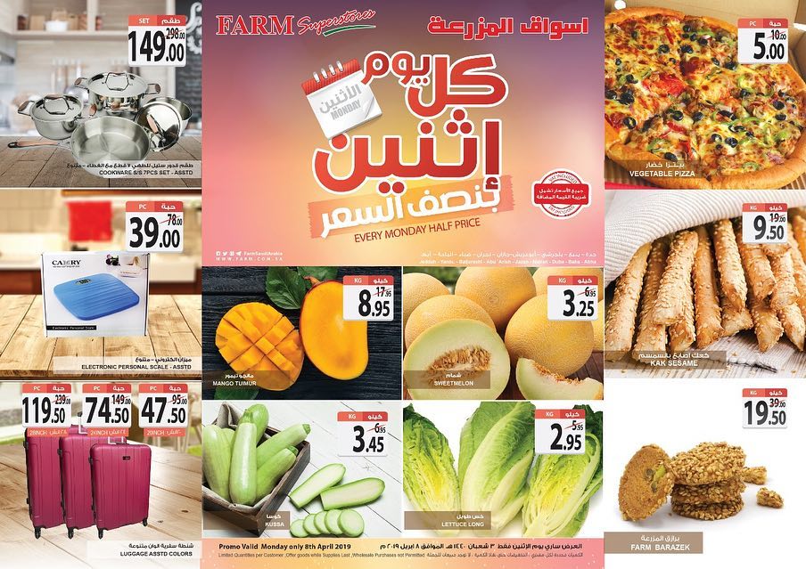 عروض نت تقدم لكم احدث عروض اسواق المزرعة جدة السعودية الجديدة فى صفحة واحدة – عروض كل اثنين بنصف الثمن من اسواق المزرعة – و ذلك ليوم الاثنين الموافق 8 ابريل 2019 او حتى نفاذ الكمية من اسواق المزرعة هايبر ماركت بجميع الفروع.