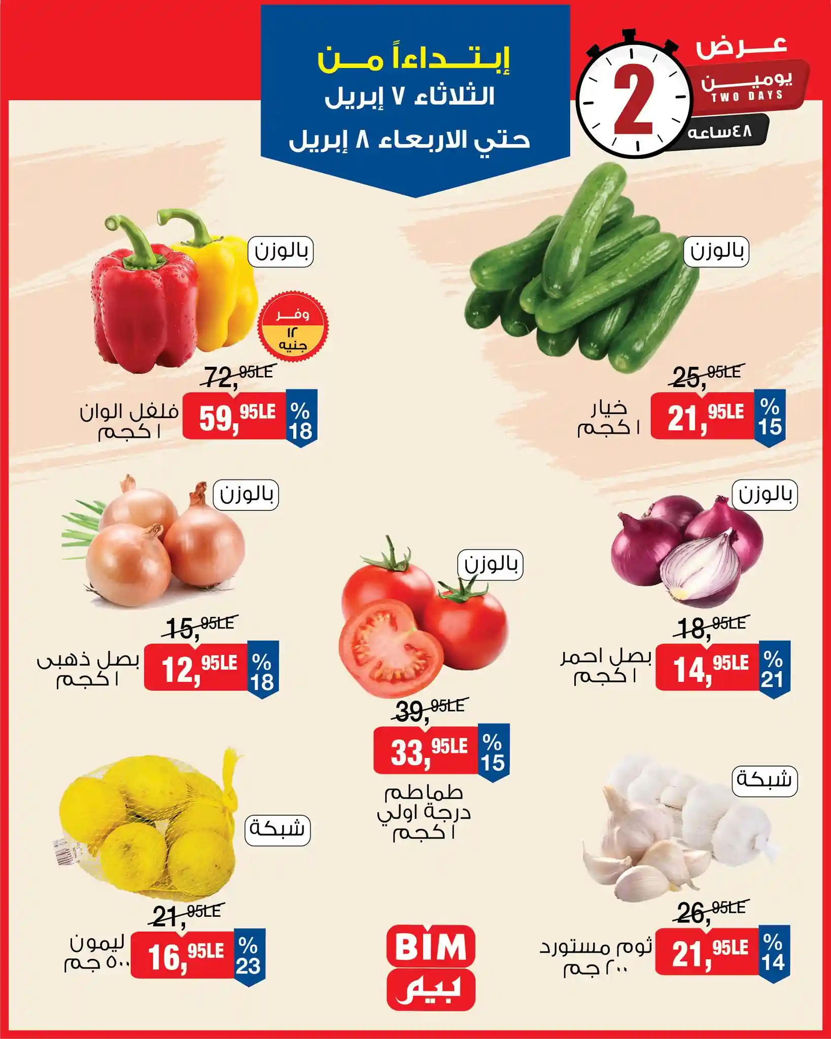 الخصومات الجديدة سارية من الثلاثاء 7 ابريل حتى الاربعاء 8 ابريل 2026 فى كل فروع بيم ماركت المنتشرة فى مصر وتصل لاكثر من 500 فرع 🔥