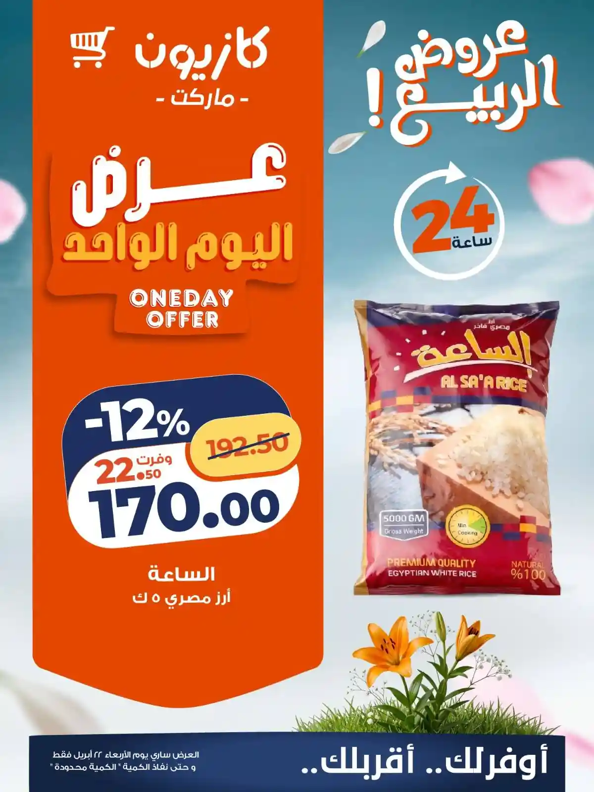 إلحق عرض اليوم الواحد من كازيون. العرض ساري يوم الأربعاء 22 أبريل فقط وحتى نفاذ الكمية “الكمية محدودة”.